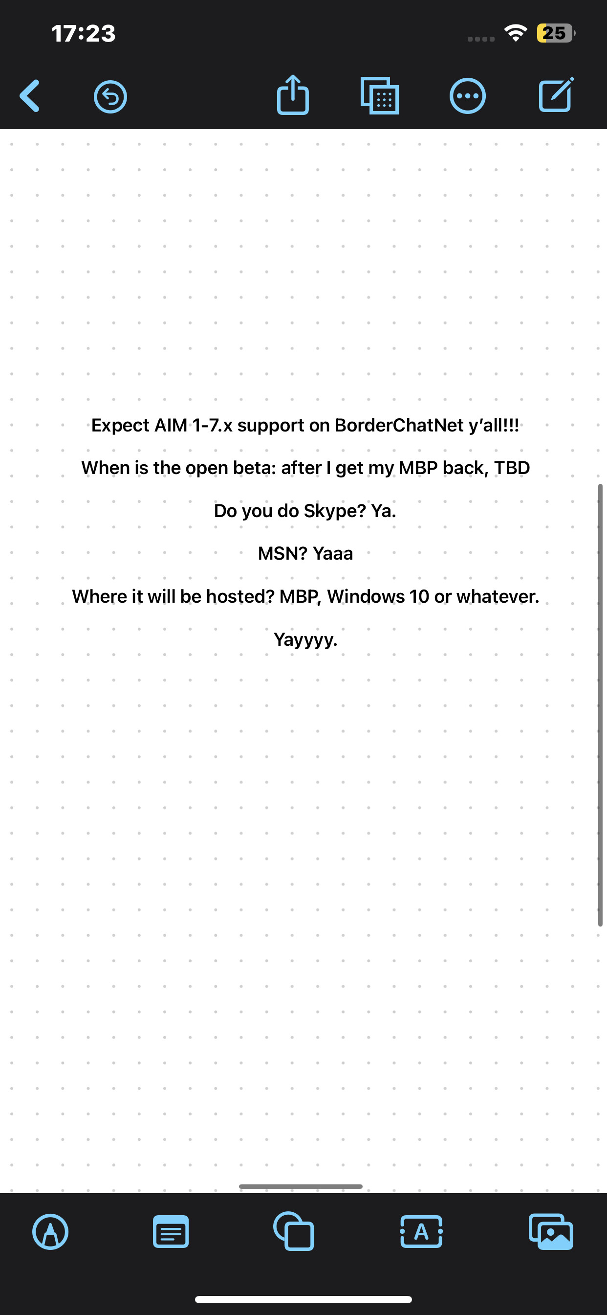 I expect AIM 1.x-7.x support and my classmates to be there. But unsure of what computer I will host on.
