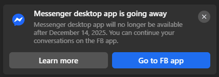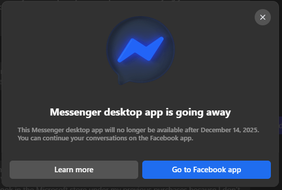 For Windows, the page says, “The Messenger app for Windows is being deprecated. After deprecation, you won’t be able to log into the app and will be automatically redirected to use the Facebook desktop app for messaging. You can continue all your conversations directly from the Facebook desktop app, with all the same features you had on the Messenger app, like desktop calling.” For Mac, it’s similar, but they say to use the website instead.