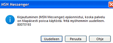 its in finnish but it says about “logging in to msn failed, because the service is temporarily unavabile. Try again later. 80070193