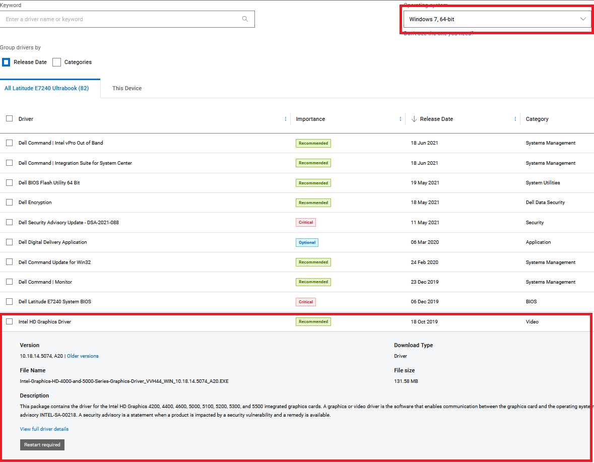 Recently I’ve purchased a Dell Latitude E7240, a windows 8/8.1 era laptop and i think it’s a refurbished model cause it has an untouched windows 10 pro key and another thing I’d like to mention that I think it was purchased with downgrade rights, cause underneath the battery compartment it has a windows 8/metro themed COA sticker that has a dell OEM product key for windows 7 professional (assuming that this laptop was originally purchased using Downgrade rights). I installed windows 7 on it and I needed drivers and I checked dells websites but most driver installers didn’t work on it, and one of the drivers I needed was a graphics driver. And I tried the same process with windows 8 (8.0) and windows 8.1 and they had the necessary drivers installed with no problems whatsoever. I think it uses intel HD graphics 4400 and I wanna know if there’s a version of this driver that’s intended for windows 7 (64 bit)