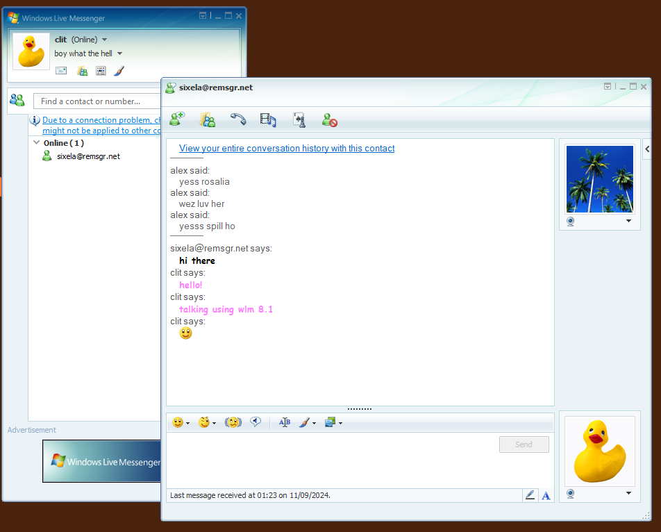 small update on windows live messenger development, i got the wlm 8.0 beta to log in, but it doesn’t show the contact list for some reason (i can’t figure out why for now but eventually i will… i hope)
